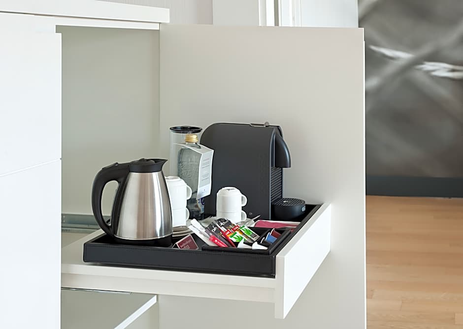 There is also an espresso machine, a kettle, work desk and safe in the room.